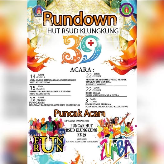 Puncaknya, Minggu, 25 Januari 2026, seluruh masyarakat Klungkung diajak hadir dan merayakan Puncak HUT RSUD Klungkung ke-39 di Alun-Alun Ida Dewa Agung Jambe dengan rangkain kegiatan FunRun, Zumba dan perayaan serimonial. Sebuah momentum bersama untuk mempererat kebersamaan, memperkuat sinergi, dan merayakan perjalanan panjang RSUD Klungkung dalam memberikan pelayanan terbaik bagi masyarakat.